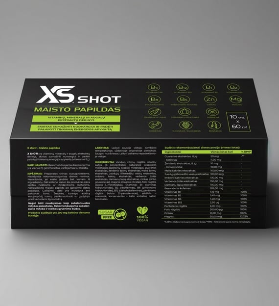 XS Shot maisto paildas, siūlantis sprendimą, kaip natūraliai ir sveikai palaikyti energijos lygį kasdien. Produktas sudarytas iš daugiau negu 16 skirtingų ingredientų, įskaitant vitaminus, mineralus ir augalinius ekstraktus. Kiekvienas iš šių komponentų buvo parinktas su tikslu sumažinti nuovargio pojūčius, gerinti koncentraciją ir bendrą organizmo būklę.